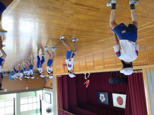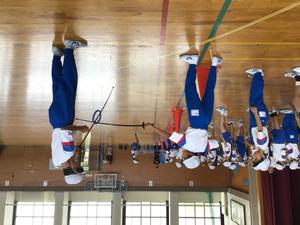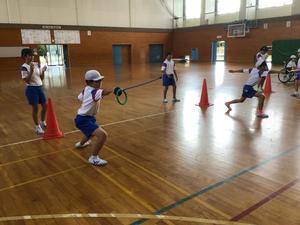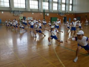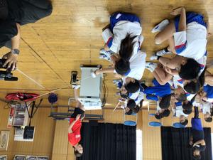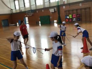 体育館では、フェンシングの構え方を学びました。