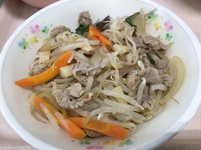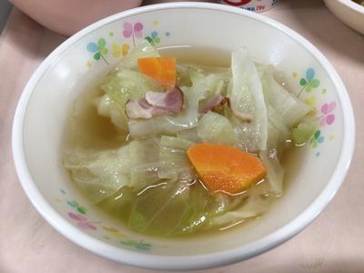 今日の献立は、ごはん(麦入り)、豚肉の香り炒め、キャベツのスープ、牛乳、ヨーグルトでした。