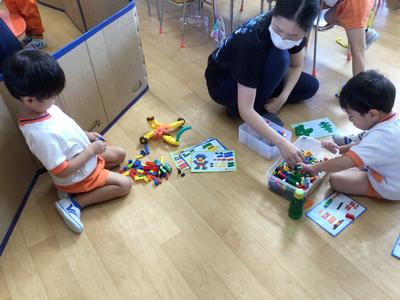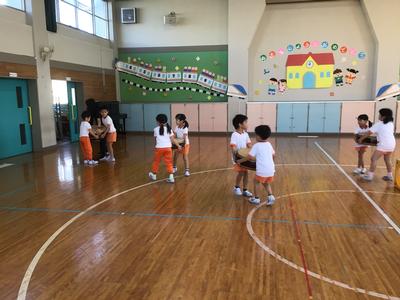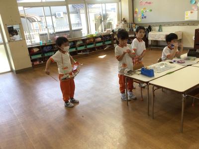 今日の様子をお届けします。たんぽぽ・ゆり組は、思い思いに遊びを楽しんでいました。ふじ組は、だるまさんがころんだをしていました。たいこの片付けも力を合わせておこなっていましたよ。