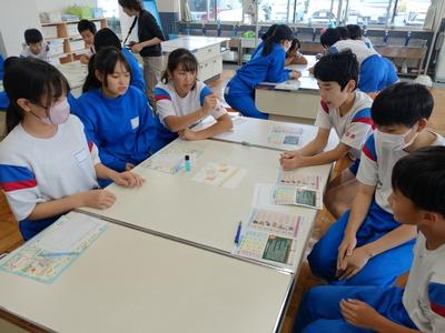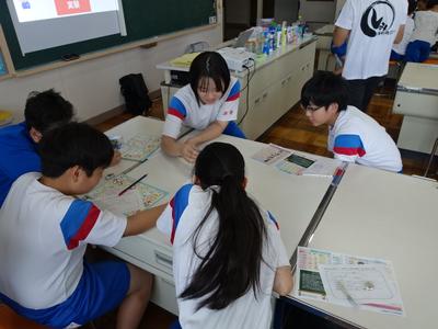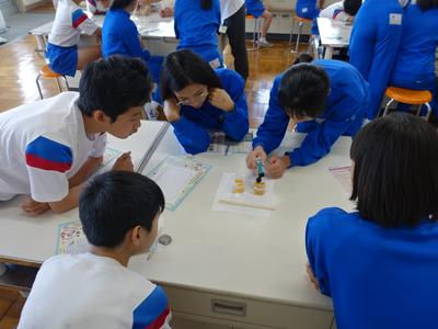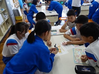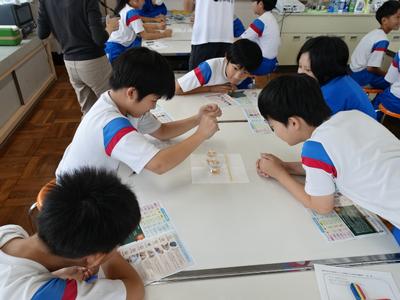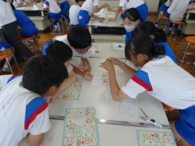 6年生家庭の授業風景です。今日は、洗濯について学習するため、専門の先生に来ていただく「出前講座」が行われました。下の写真は、洗剤の力を確認するため、「洗剤あり」と「洗剤なし」で汚れの落ち具合を実験しているところです。