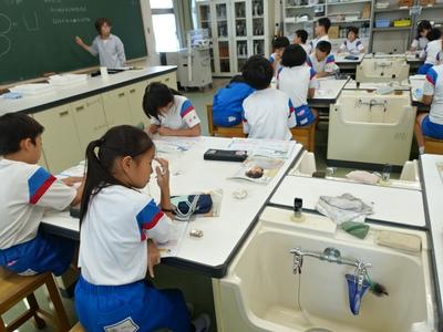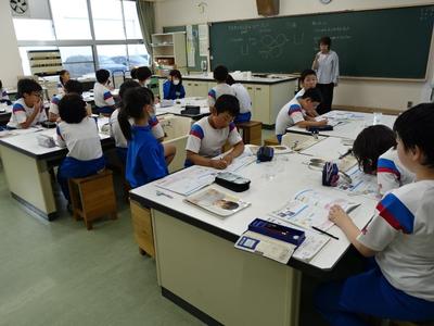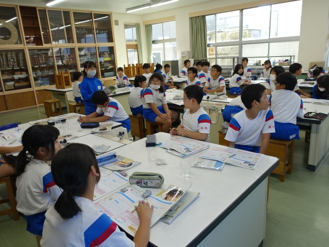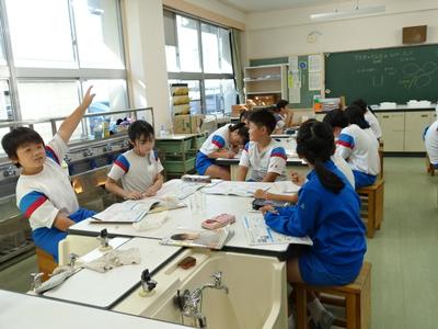 4年生理科の授業風景です。今日は、「空気中の水蒸気は、元の水にもどるのか」という課題を解決するために実験を行いました。下の写真は、実験から分かったことを発表しているところです。