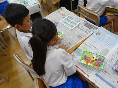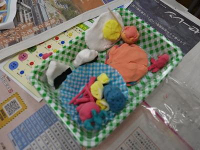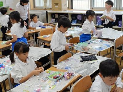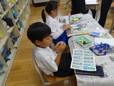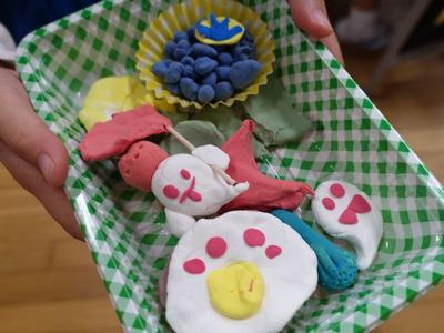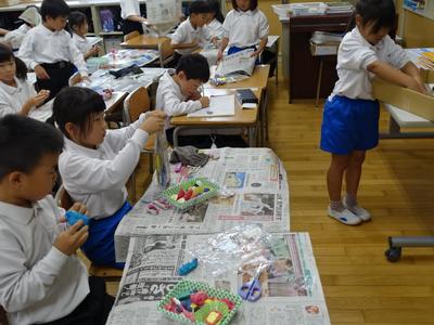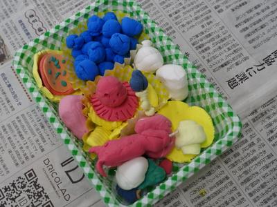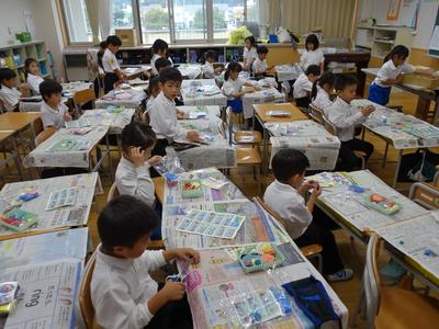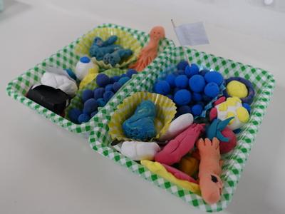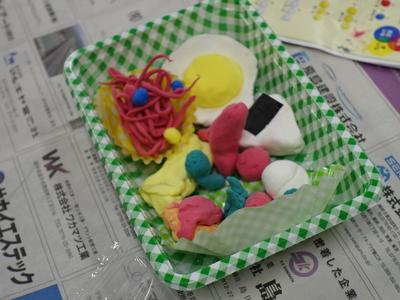 1年生図工の授業風景です。今日は、紙粘土でお弁当を作りました。どのお弁当も本物そっくりです。完成した作品を多くの子が見せに来てくれましたよ。