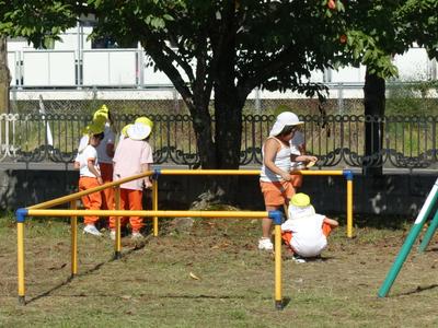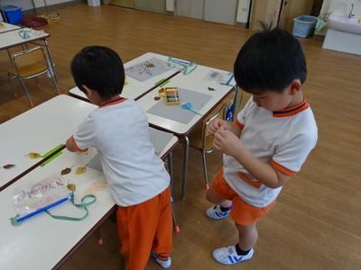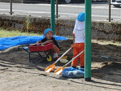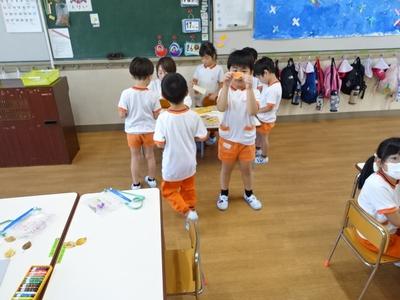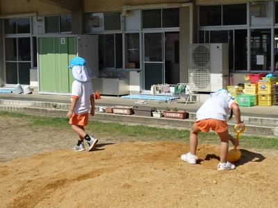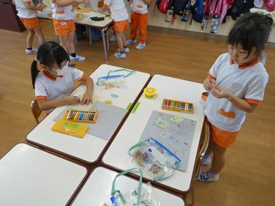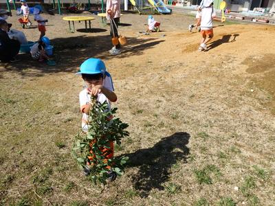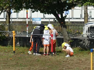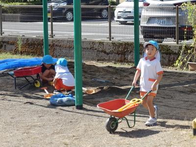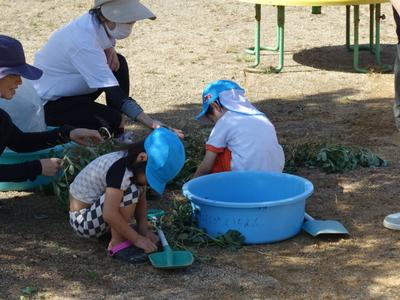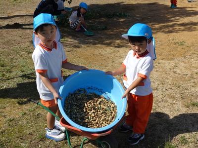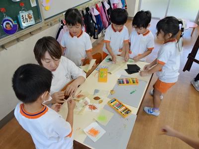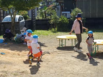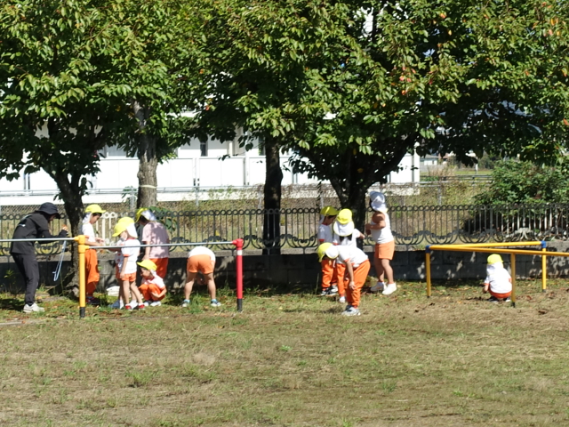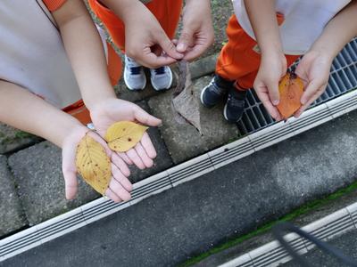 幼稚園の今日の様子をお届けします。ふじ組は、太鼓の練習が終わり葉っぱ集め、ゆり組は、集めた葉っぱで作品作り、そしてたんぽぽ組は、外遊びです。(今日は秋晴れ‼)