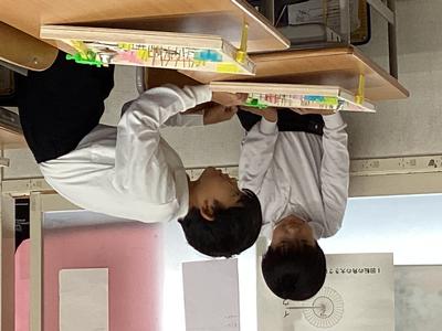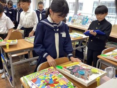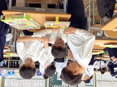 図工で作っているコリントゲームができあがったので、みんなで遊びました。