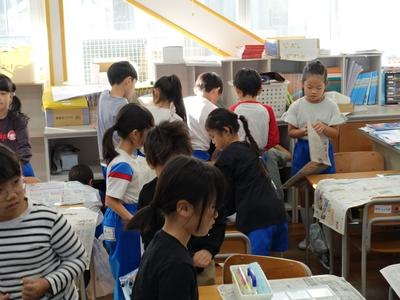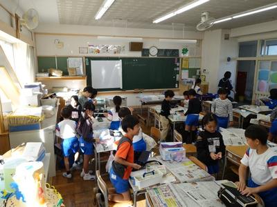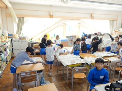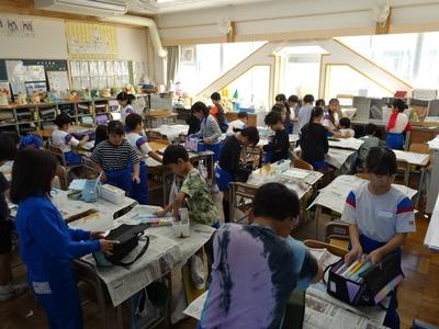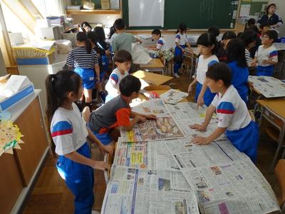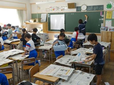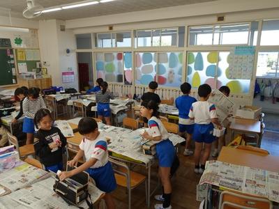 2年生図工の様子です。今日は絵の具を使って背景を塗ります。下の写真は、机が汚れないよう、新聞紙を敷いているところです。準備もバッチリですね‼