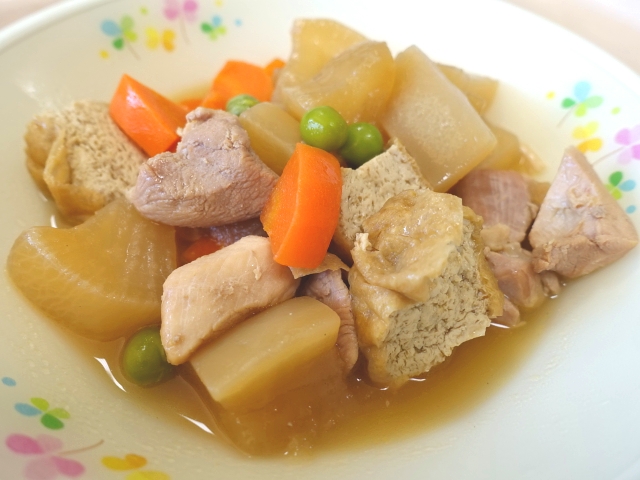 今日の献立は、ご飯 牛乳 揚げと鶏肉のうま煮 えのきと小松菜の味噌汁 です。過ごしやすい季節になりました。モリモリ食べて、昼休みは元気に遊びましょう‼