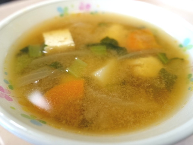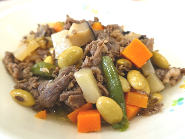 今日の献立は、ご飯 牛乳 五目煮豆 小松菜の味噌汁 ふりかけ です。煮豆には牛肉がたっぷり入っていて、とってもおいしかったですよ。