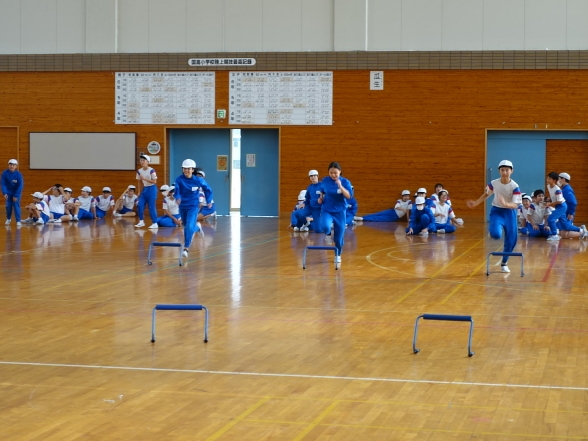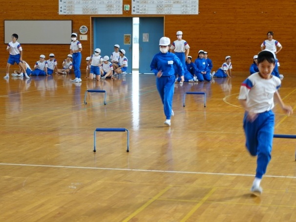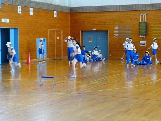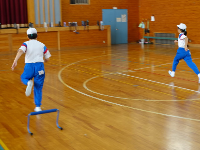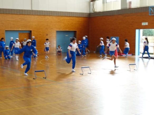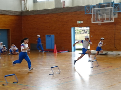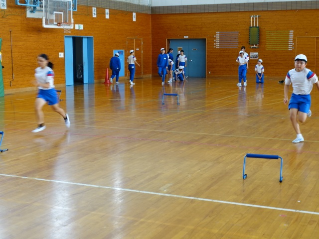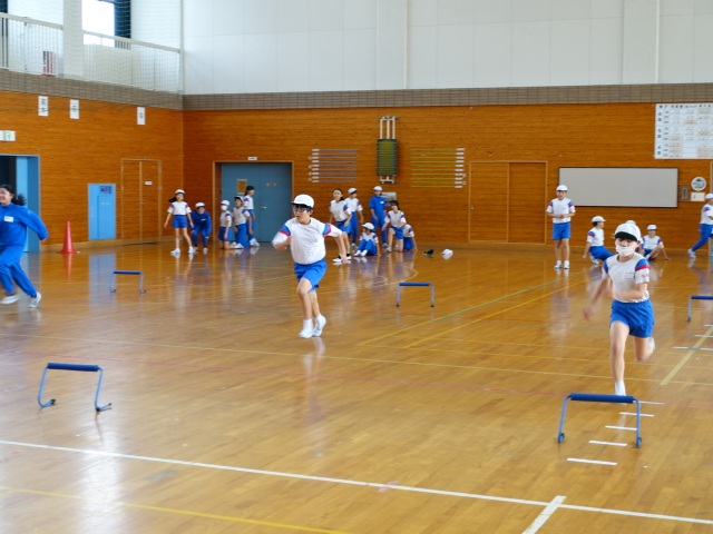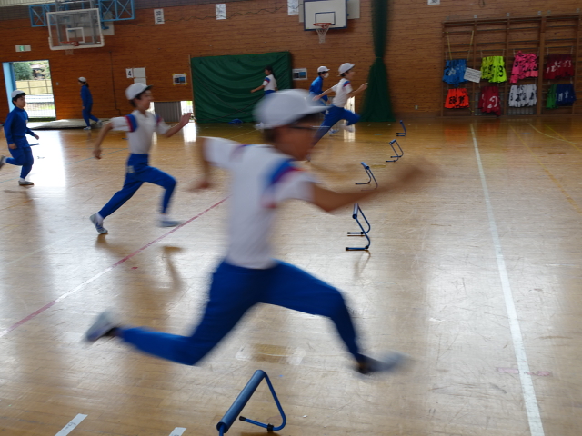 6年生体育の授業風景です。今日は、体育館でハードル走を行いました。ハードルを低めに設定し、スピードアップをねらいます。