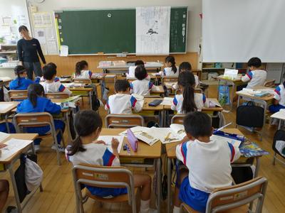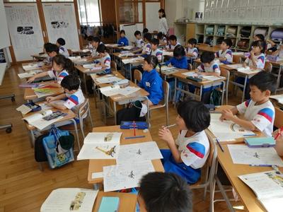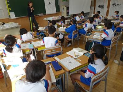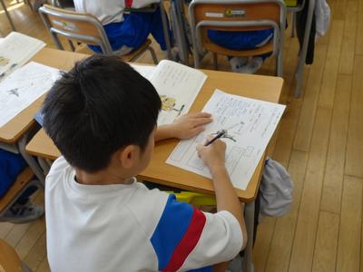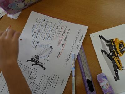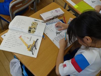 1年生は、国語の時間に説明文「じどうしゃくらべ」の学習をしています。今日は、クレーン車の「しごと」と「つくり」を読み取り、ワークシートにまとめました。