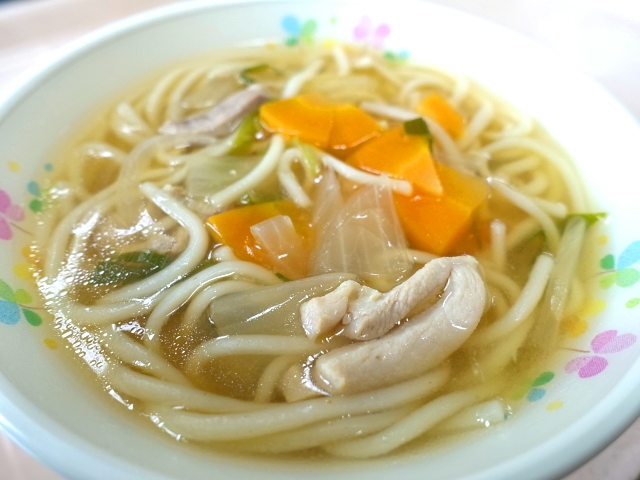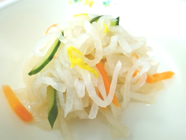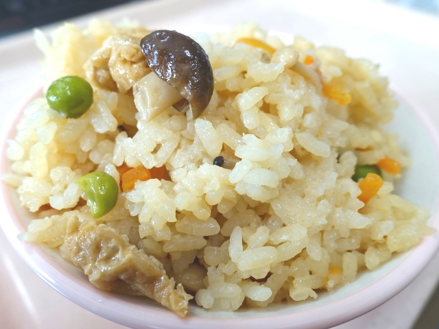 今日の献立は、越前市市制記念献立です。油揚げご飯 牛乳 大根の菊花あえ 麦とろ麺のすまし汁 が出ましたよ。