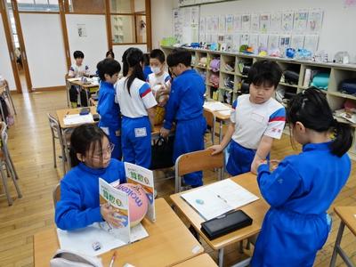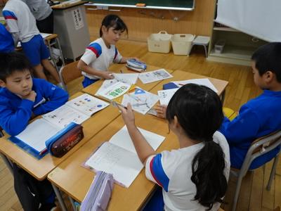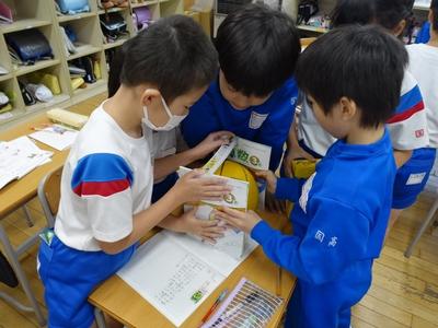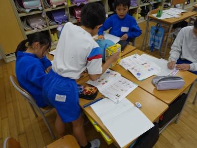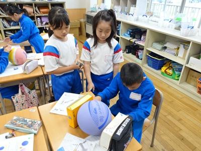 3年生が算数の時間に球の学習をしました。下の写真は、球(ボール)の直径を測定しているところです。