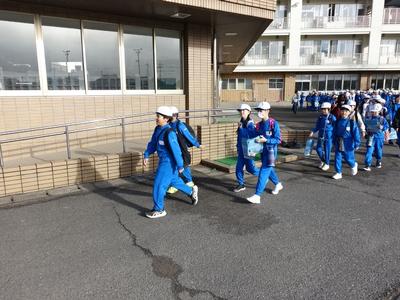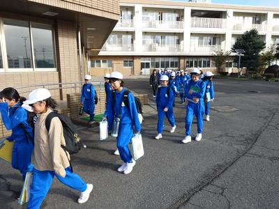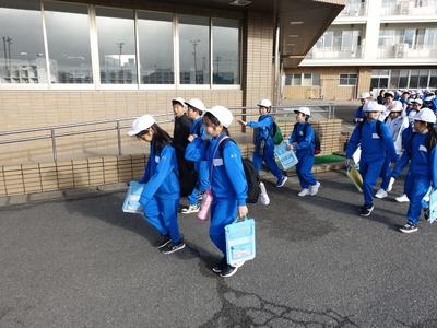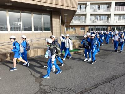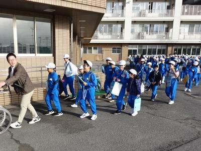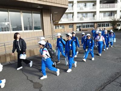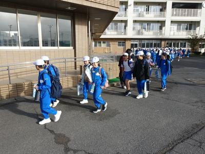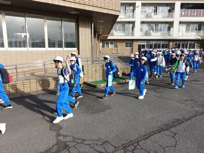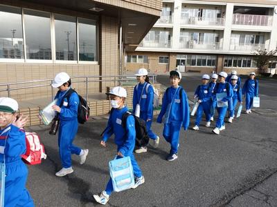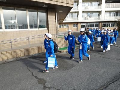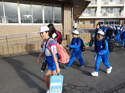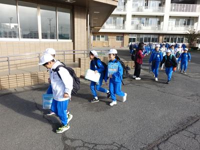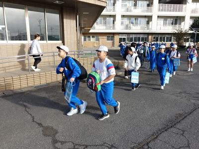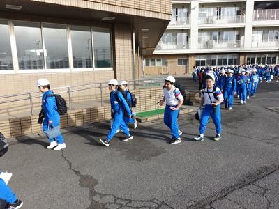 5年生が校外学習へ出発する様子をお届けします。今日は、防災センターや県庁を見学する予定です。天気はバッチリです、気をつけていってらっしゃい‼