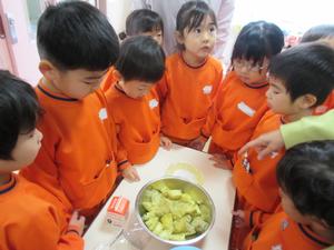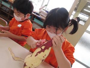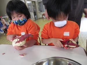 収穫したさつまいもを使って、さつまいもの茶巾絞りを作りました。ふじ組さんがさつまいもを洗ったり、皮をむいたりたり準備を手伝ってくれました。