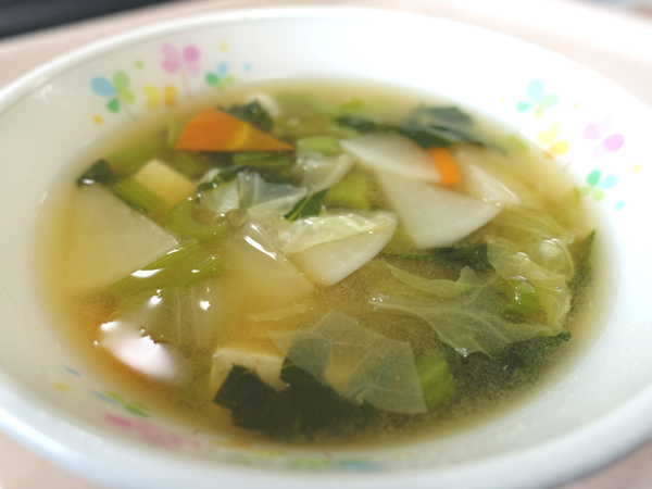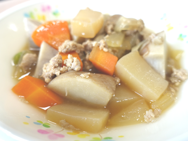 今日の献立は、ご飯 牛乳 里芋の鶏そぼろ煮 白菜の味噌汁 みかん です。里芋がホクホクしていて、大変美味しい鶏そぼろ煮でしたよ。