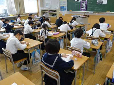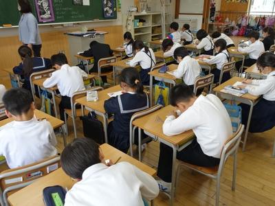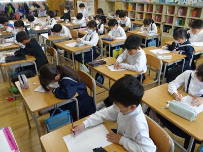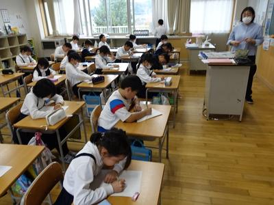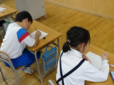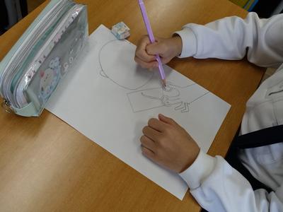 5時間目、図工の授業風景です。今日は、版画の下絵を描きました。下絵を何枚か描いた後、実際に版画版に描いていきます。