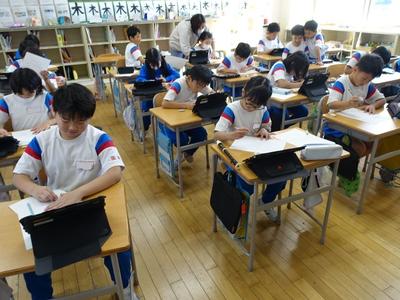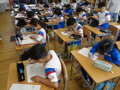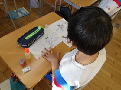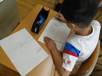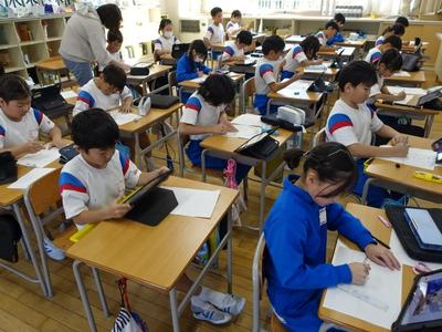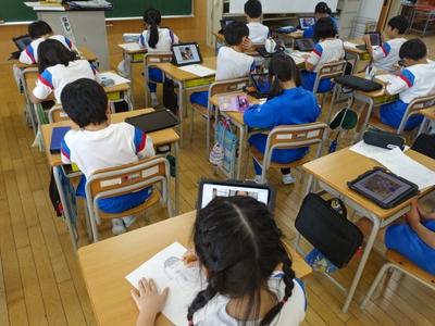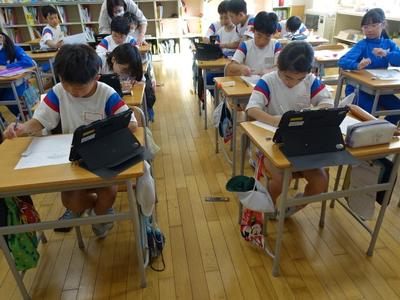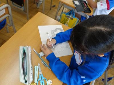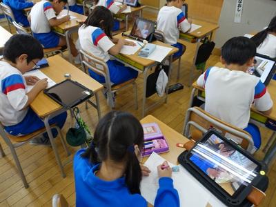 3年生が版画の下絵を描きました。みんなの様子を見ていると、「○○をしている瞬間」を描きたい子が多いようです。その瞬間をタブレットで撮ってもらい、写真を観察している子もいましたよ。