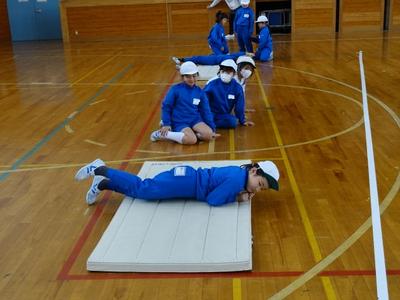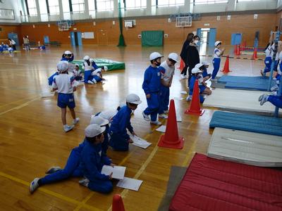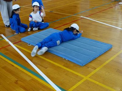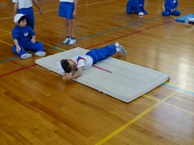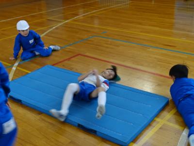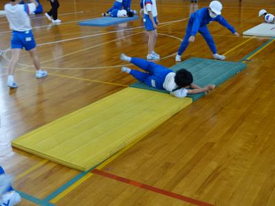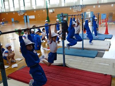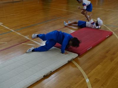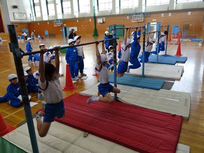 2年生が、鉄棒とマット運動を行っていました。準備運動を兼ね、①マットの上を転がっているところ ②鉄棒にぶら下がっているところの様子をお届けします。