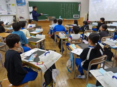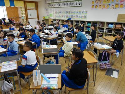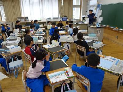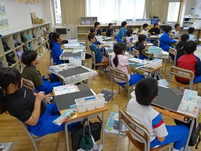3年生の図工の授業風景です。版画の板を掘り終えたようですね。下の写真は、印刷に入る前に、先生の話を聞いているところです。満足のいく作品にしてくださいね。