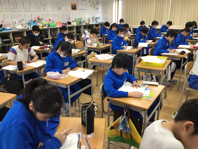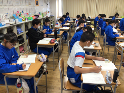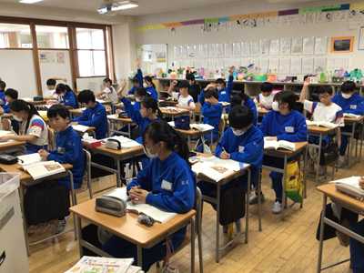 6年生国語の授業風景です。今日は、登場人物が場面ごとに、本とどのように向かい合っているのか、意見交換をしました。