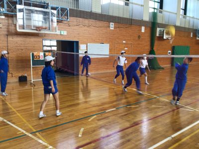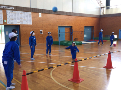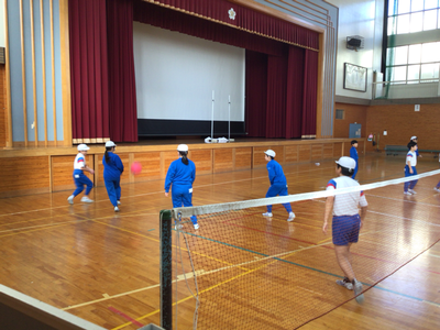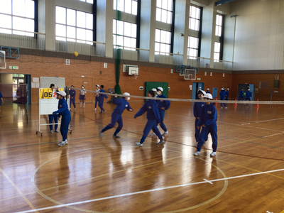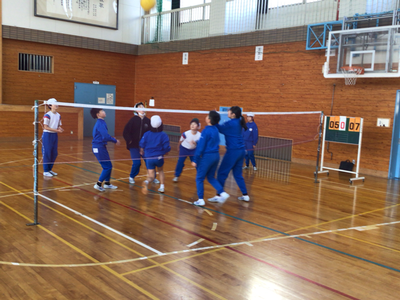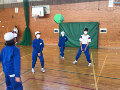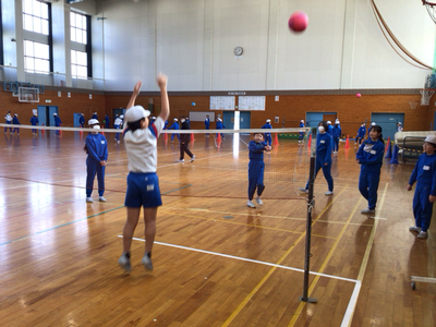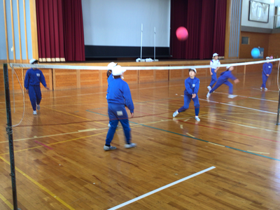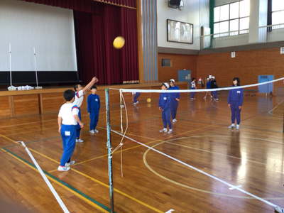 6年生が体育の時間にソフトバレーボールを行いました。ラリーが続くよう、『ワンバウンドOK』というルールが特別に設けられています。体育館の中に6年生の歓声が響き渡っていました。