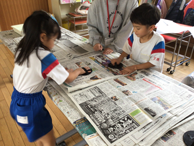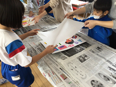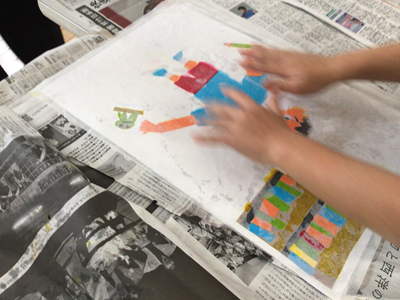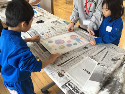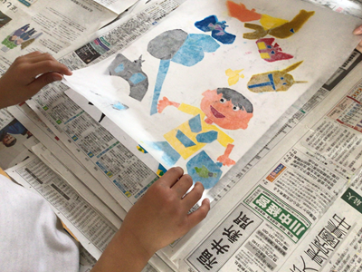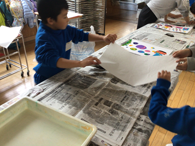 1年生が制作に取り組んできた紙版画、今日は刷りの日です。名前を呼ばれた子から順に作業に入りました。紙をめくる瞬間の表情がとてもよかったですよ。