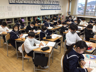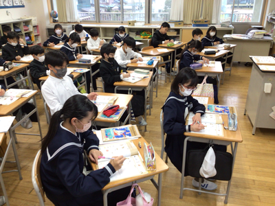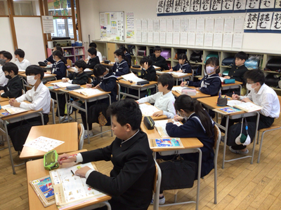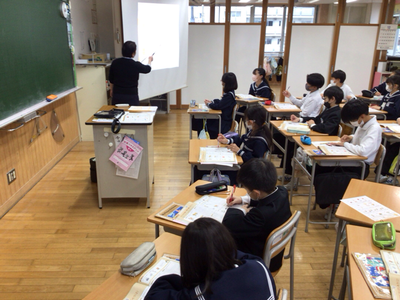 5年生英語の授業風景です。今日は、英語の音声を聞き取り、その単語を書きました。『b』と『v』が似ていて、ここを聞き分けることができるかがポイントですね。