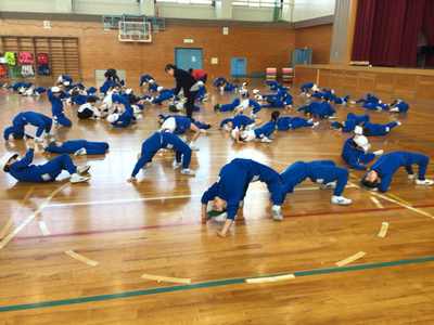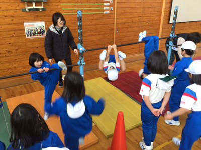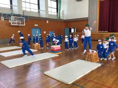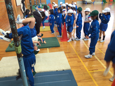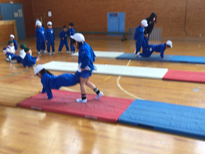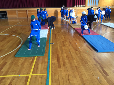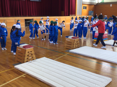 1年生体育の様子です。今日は、クラスごとに分かれ、跳び箱、マット、鉄棒を行いました。体育館は寒いのですが、みんな元気いっぱいです‼