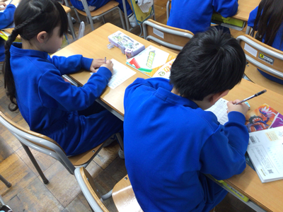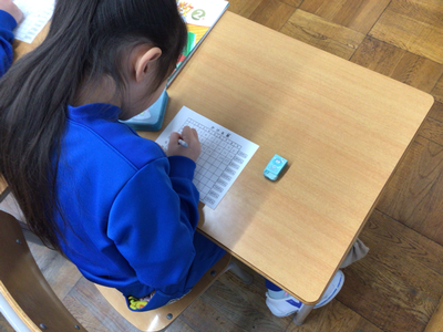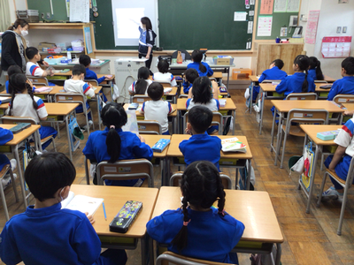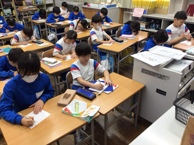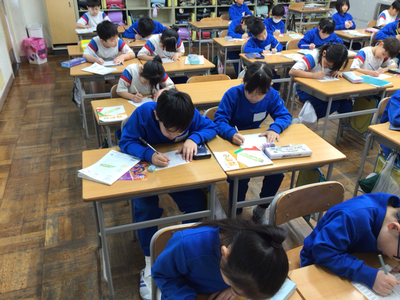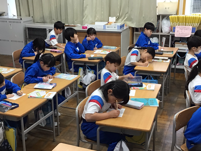 2年生算数の授業風景です。現在、九九の学習をしていますが、みんな覚えましたか。下の写真は、そのチェックをしているところです。時間も計っているようですよ。繰り返していくことが大切ですね。