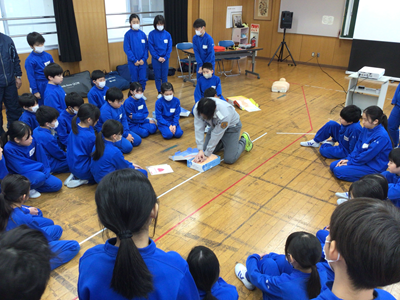南越消防組合の皆様を講師にお招きし、救命講習会を開催しました。子どもたちは胸骨圧迫の手順やAEDの使い方を教わり、真剣な表情で実技に挑戦。「自分たちの手が命を繋ぐ」という責任感と、いざという時に一歩踏み出す勇気の大切さを学びました。地域の安全を支える一員として、非常に意義深い体験となりました。今日は1組と2組、明日は3組と4組で行われます。