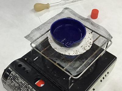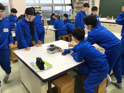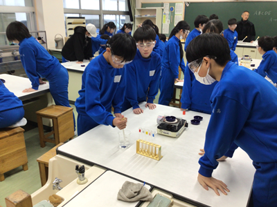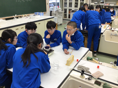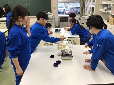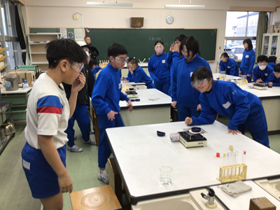 6年生理科の授業風景です。今日は、5種類の水溶液(食塩水、重曹水、うすいアンモニア水、うすい塩酸、炭酸水)の違いを調べました。調べることは、①見た目 ②におい ③蒸発させたときのにおい ④蒸発させた時に残るもの です。万が一のことを考え、保護メガネ着用で実験しています。