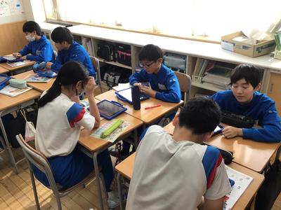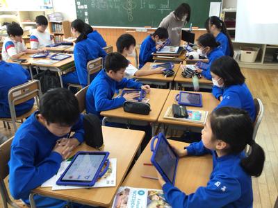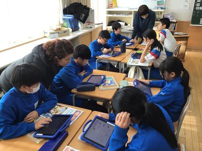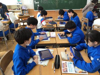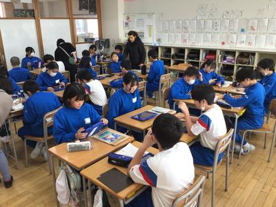 6年生外国語の授業風景です。今日は、楽しかった冬休みのことについてペアでやり取りをしました。6年生になると、過去形の学習も入ってくるのですね。(昔は中学校で習っていた内容だけに、みんなすごいです)