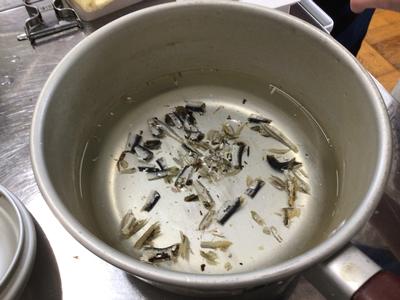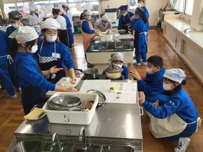5年生が調理実習を行いました。作ったのは、ご飯と味噌汁です。ご飯は便利は炊飯器ではなく、透明の鍋を使いガスコンロで調理しました。ガス火を注意深く調節しながら炊いていき、最後に蒸らして完成です。味噌汁の大根はいちょう切り、あげはたんざく切り、ネギは小口切りとそれぞれの切り方で食材を切り、出汁は煮干しから作りました。