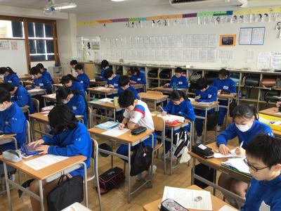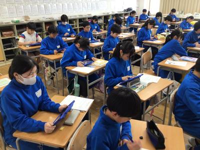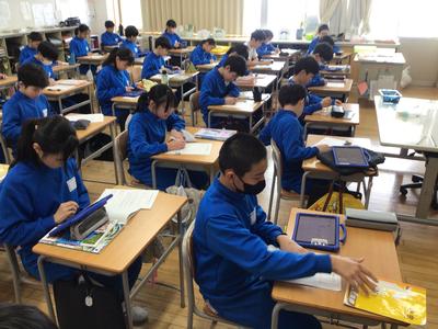 6年生の他のクラスでも絵手紙を描きました。教室を覗いた時は完成した後で、振り返りを書いているところでした。完成した絵手紙は、「さすが6年生」と言ってしまいたくなるような迫力ある作品ぞろいでしたよ。