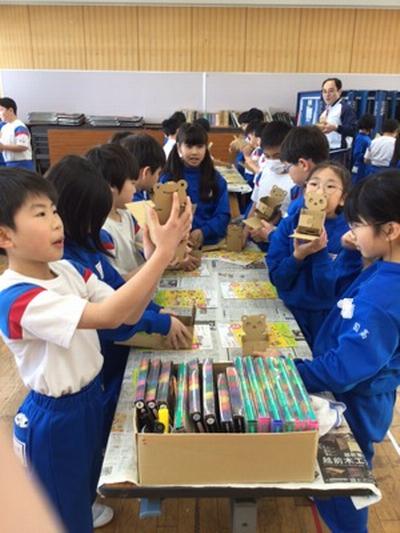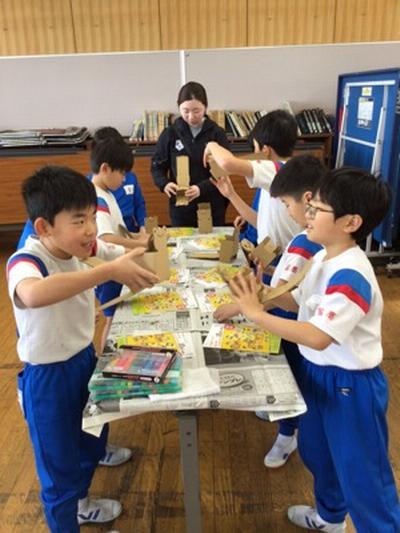 (株)レンゴーさんから、段ボールのひみつを教えていただいた後、段ボールを使った工作をしました。