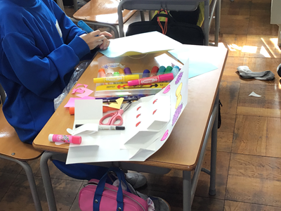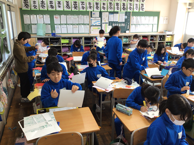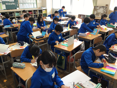 4年生図工の授業風景です。今作っているのは、「幸せを運ぶカード」です。みんなの様子を見ていると、完成に近づいているようですよ。