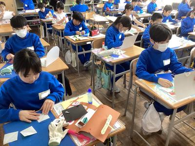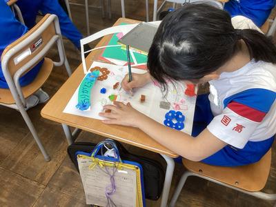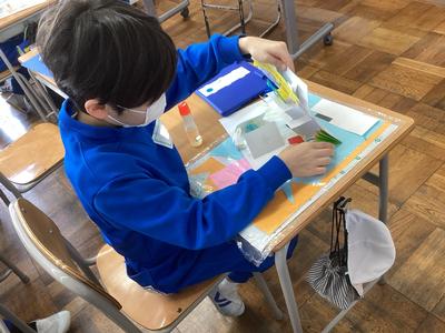 図工の時間に、幸せを運ぶカードを作っています。