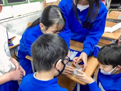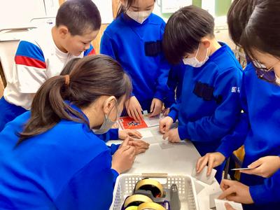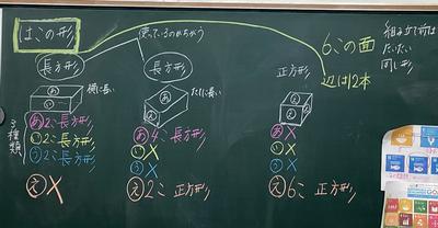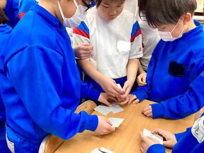 まず、はこの形の特徴を確認するために、一人一枚ずつ持った長方形や正方形を組み合わせて、箱を作りました。