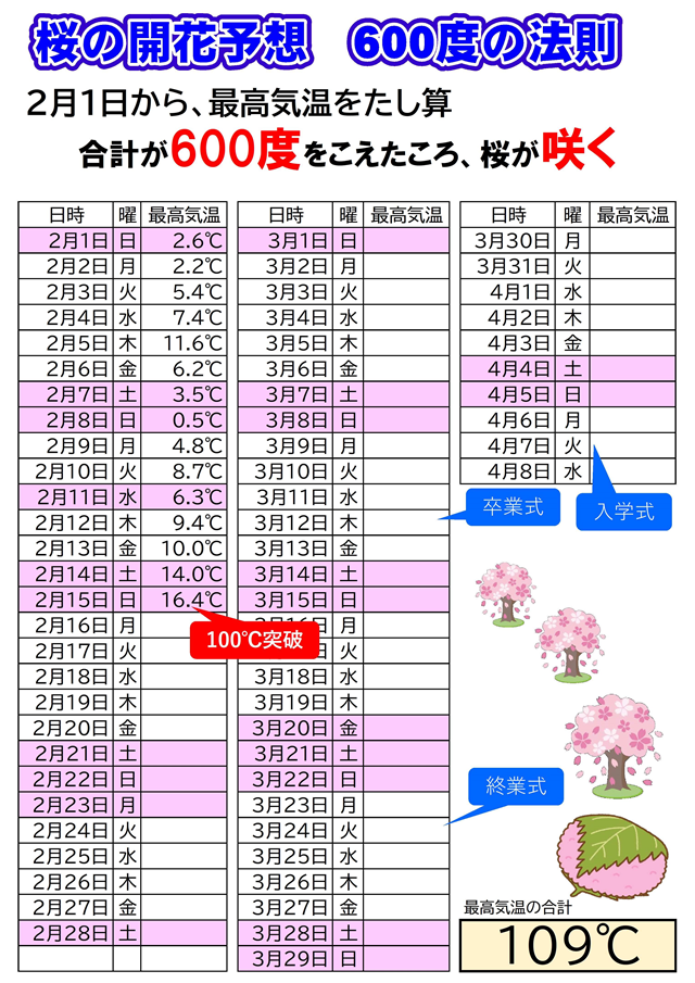 桜の開花600度の法則(2月1日以降の最高気温を足し算していき、 合計が600度を超えた頃に桜が開花)ですが、15日(日)に100度を突破しました。