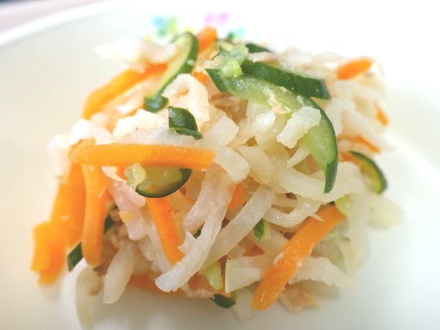 今日の献立は、きなこ揚げパン 牛乳 チキンポトフ 切り干し大根のサラダ 煮干し です。きなこ揚げパンは、数日前から楽しみにしていた子がいると聞きましたよ。お待たせしました。味わって食べてくださいね。