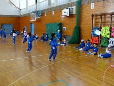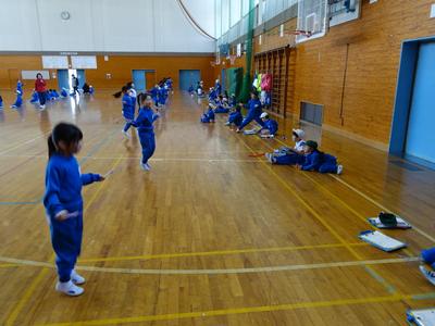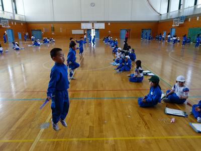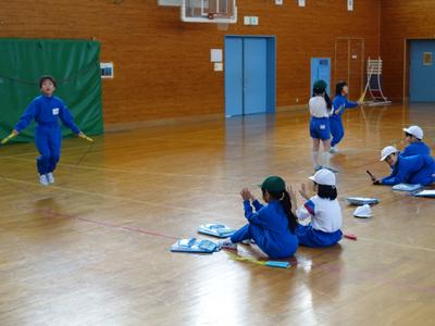 1年生が体育館でなわとびを行いました。2人1組になり、跳ぶ人と数える人の役割が途中で変わるようです。数える人は、跳んだ数を数え間違えないよう、指を使っている子もいましたよ。(しっかり数えてあげてくださいね)
