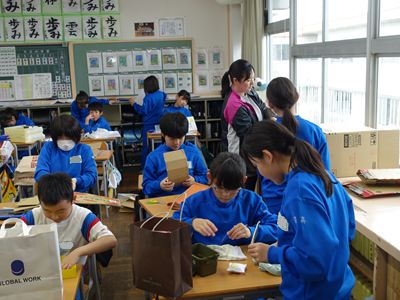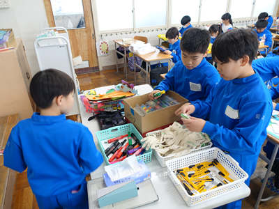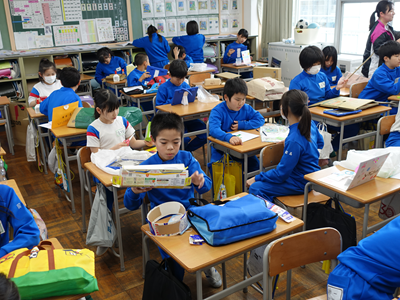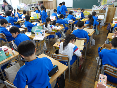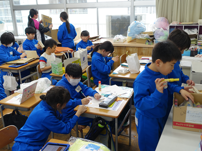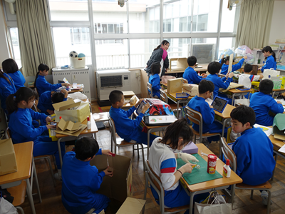 4年生の教室の中が盛り上がっています。捨てられそうなものを使って新たな作品を作っていました。みんな楽しそうです‼