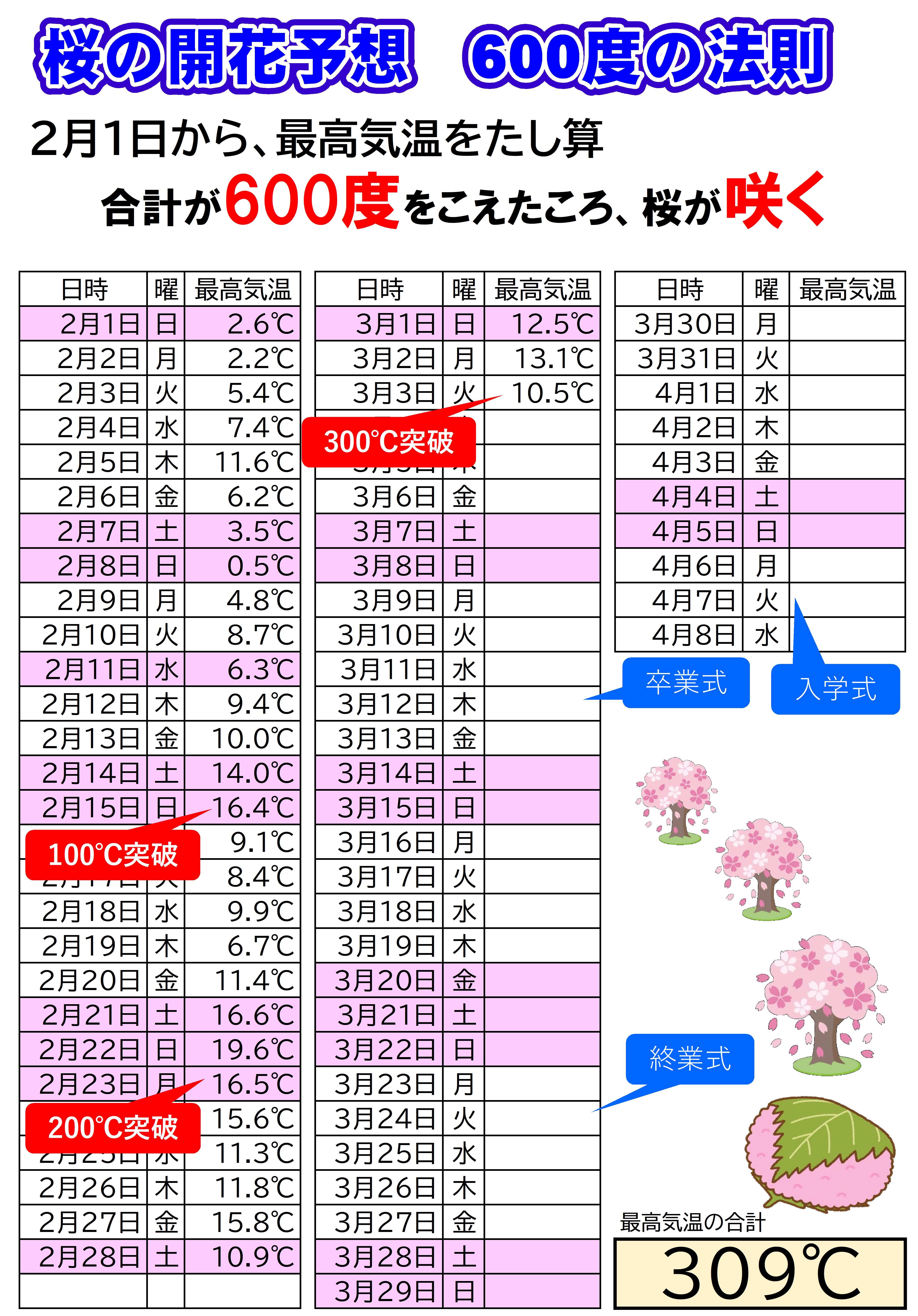 桜の開花600度の法則(2月1日以降の最高気温を足し算していき、 合計が600度を超えた頃に桜が開花)ですが、3日(火)に300度を突破しました。