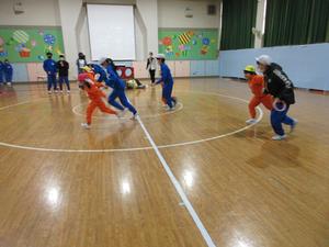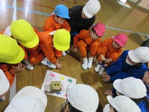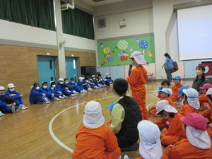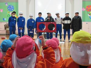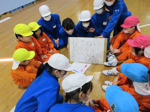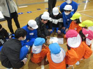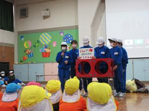 5年生が防災についての総合的な学習の時間に幼稚園に発表しにきてくれました。発表では、すごろく、リレー、ジャンケン列車、鬼ごっこ