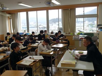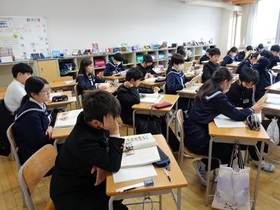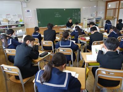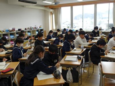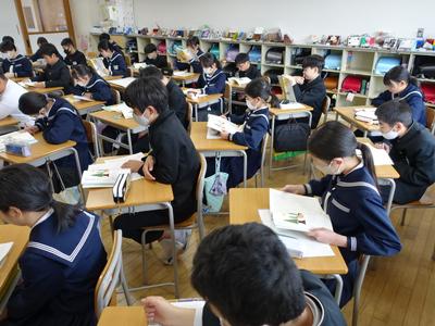 6年生国語の授業風景です。下の写真は、先生が教科書に掲載されている「人間は他の生物と何がちがうのか」という話を読んでいるところです。もしかしたら、これが小学校最後の国語の授業かもしれません。