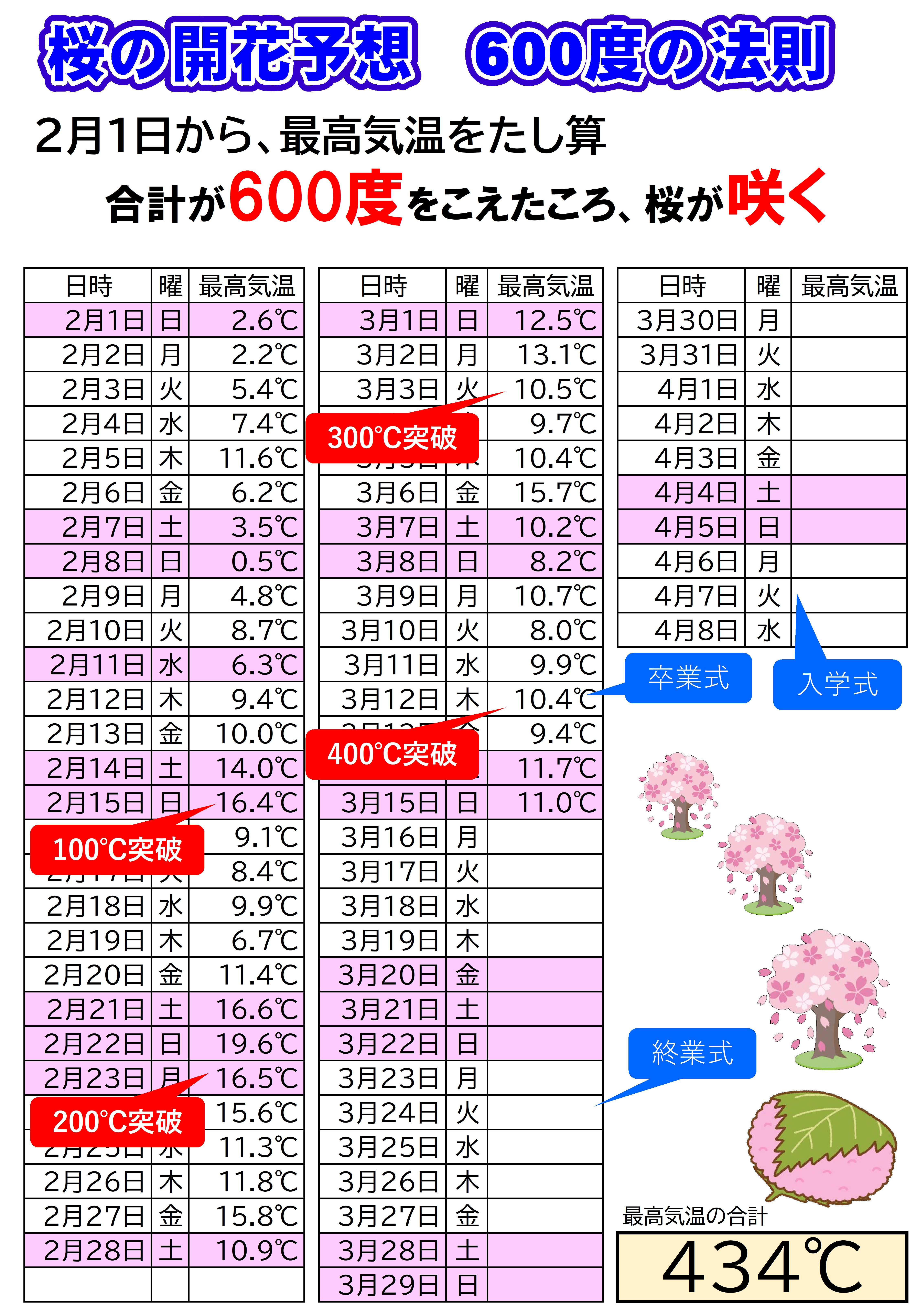 桜の開花600度の法則(2月1日以降の最高気温を足し算していき、 合計が600度を超えた頃に桜が開花)ですが、12日(木)に400度を突破しました。