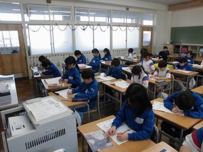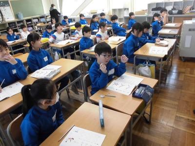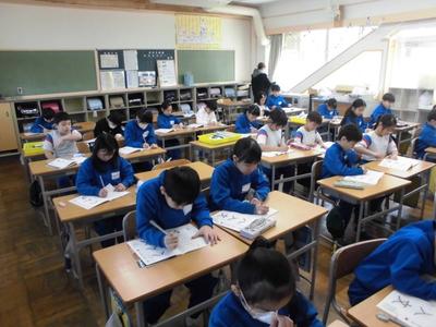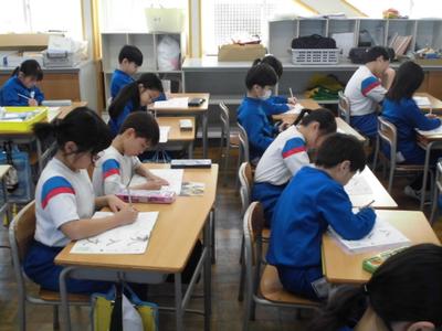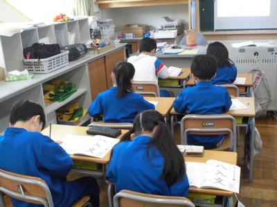 2年生国語の授業風景です。今日は画のつき方と交わり方について学習しました。下の写真は、学習したことを意識しながら丁寧に漢字を書いているところです。