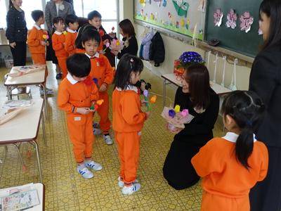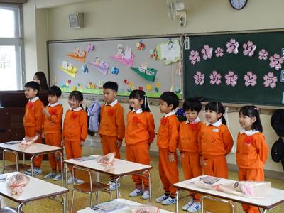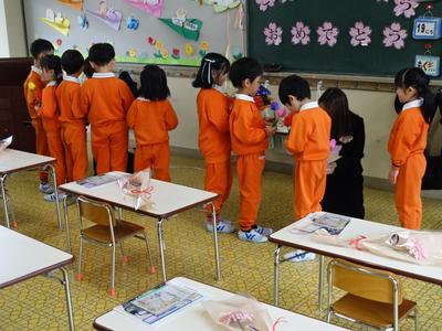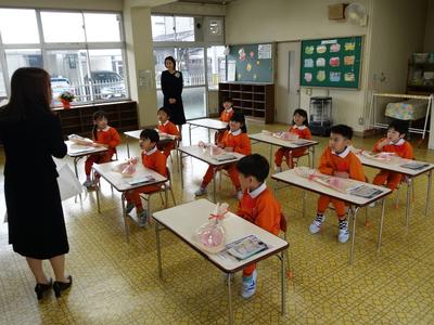 今日は、国高幼稚園の修了式が行われ、前回と合わせて全員に修了証書を授与することができました。下の写真は、修了式の後でふじ組の教室に入り、みんなで歌を歌ったり先生にプレゼントを渡したりしているところです。(とても温かい雰囲気でしたよ)さあ、次に登校するのは4月7日(火)の入学式です。みんなの入学を楽しみにしているよ‼(今日会えなかったお友だちも4月7日に会いましょうね)