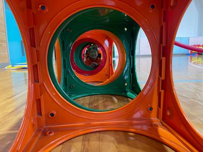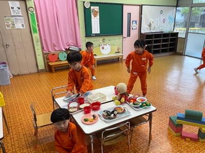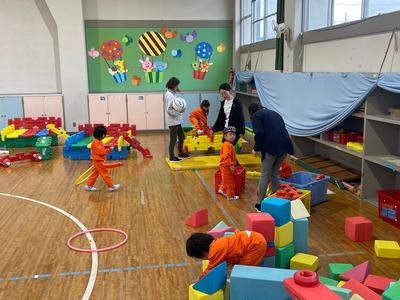 幼稚園に行ったら、ちょうど『自由遊び』の時間でした。ホールでブロックを積み上げたり、フラフープを転がしたりと、楽しそうに遊んでいました。『ごちそうごっこ』にも招待していただきました。