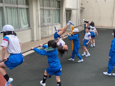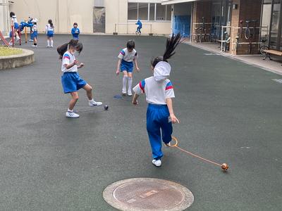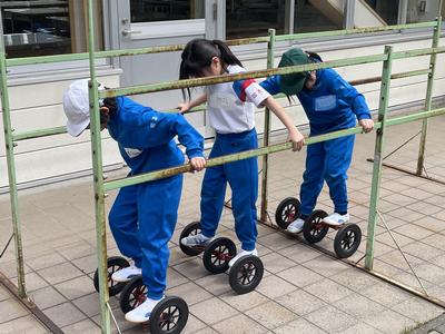 今日は暖かく、大休みになると、みんな一斉に外に飛び出してきました。中庭では『鉄棒』や『竹馬』に夢中になる子がたくさんいました。『タイヤを動かして前に進む』器具に校長も挑戦しましたが、見事に転びました…。