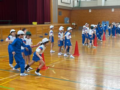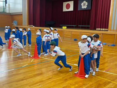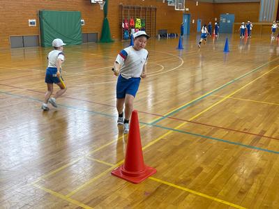 【学習指導要領】には、『かけっこ・リレーでは、(中略)調子よく走ったり、走りながらバトンの受渡しをする周回リレーをしたりすること』とあります。今日は4年生が『周回リレー』を行っていました。